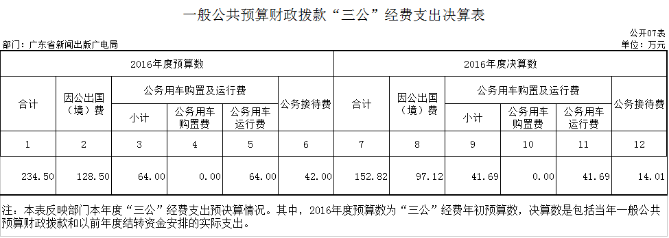 项目 2016预算 2016决算支出 2015决算支出 2016年决算支出占预算数比例 2016年决算支出比2015年增减比例 出国费 128.5 97.12 107.33 75.58% -9.51% 公务用车购置费 - 0 0 - - 公务用车运行维护费 64 41.69 119.18 65.14% -65.02% 公务接待费 42 14.01 17.34 33.36% -19.2% 合计 234.5 152.82 243.85 65.17% -37.33%